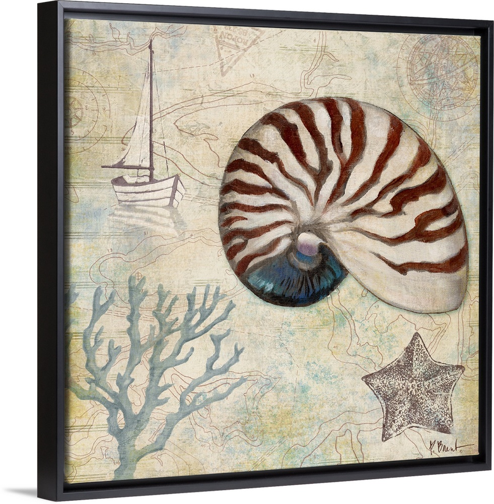 <p>Decorative panel made of different nautical elements including a nautilus shell, coral, a starfish, and a sailboat.</p>