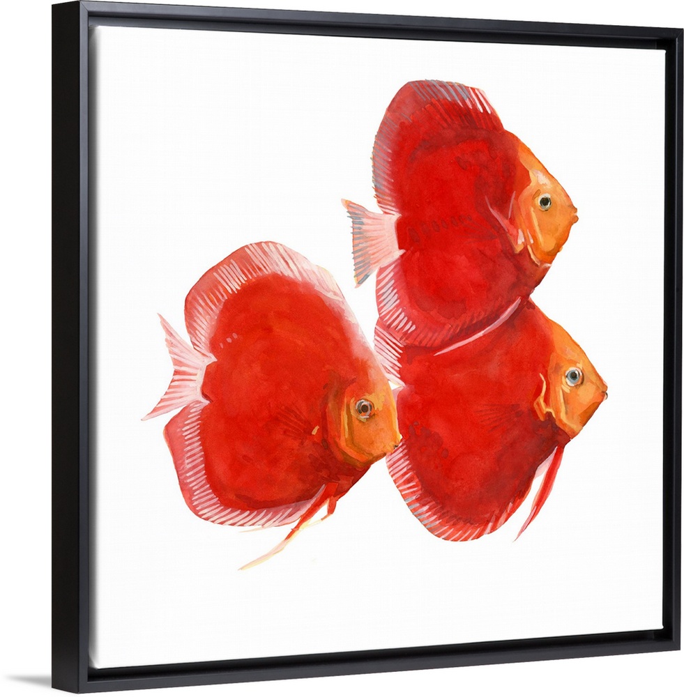 <p>Watercolor portrait of three brightly painted red discus fish.</p>