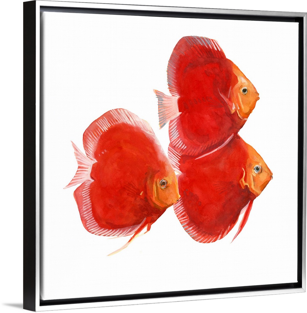 <p>Watercolor portrait of three brightly painted red discus fish.</p>