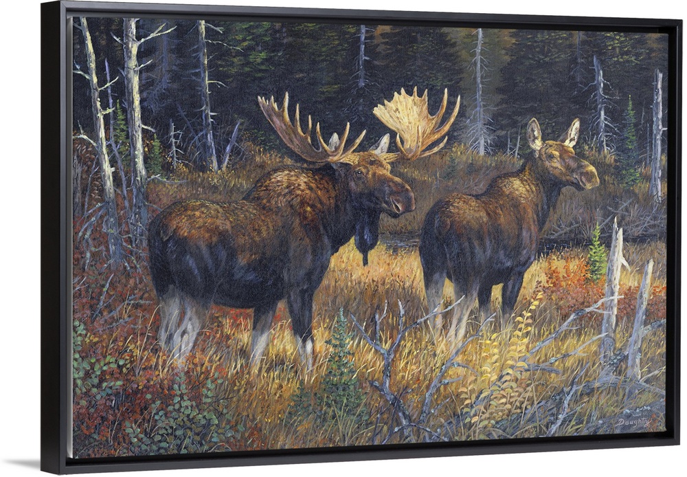 <p>Contemporary artwork of a moose bull and cow walking together in a forest in the fall.</p>