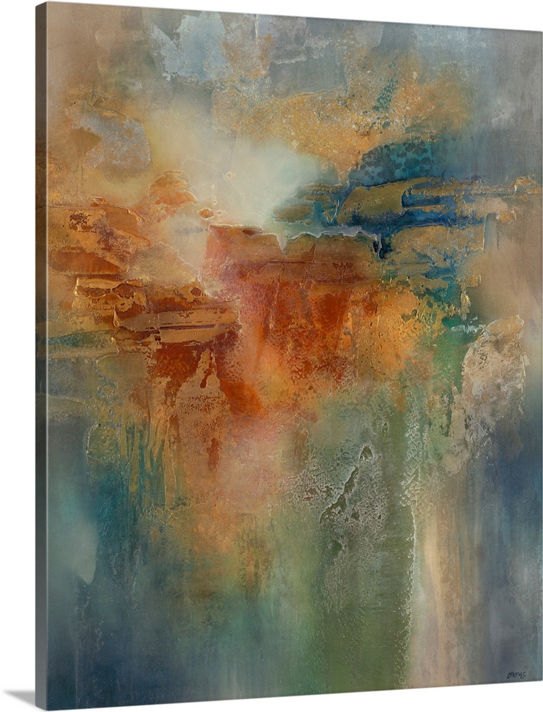 <p>Vibrant abstract art blending warm oranges, golds, and cool blues, greens. Textured layers evoke a dynamic, elemental landscape with a contemporary feel.</p>