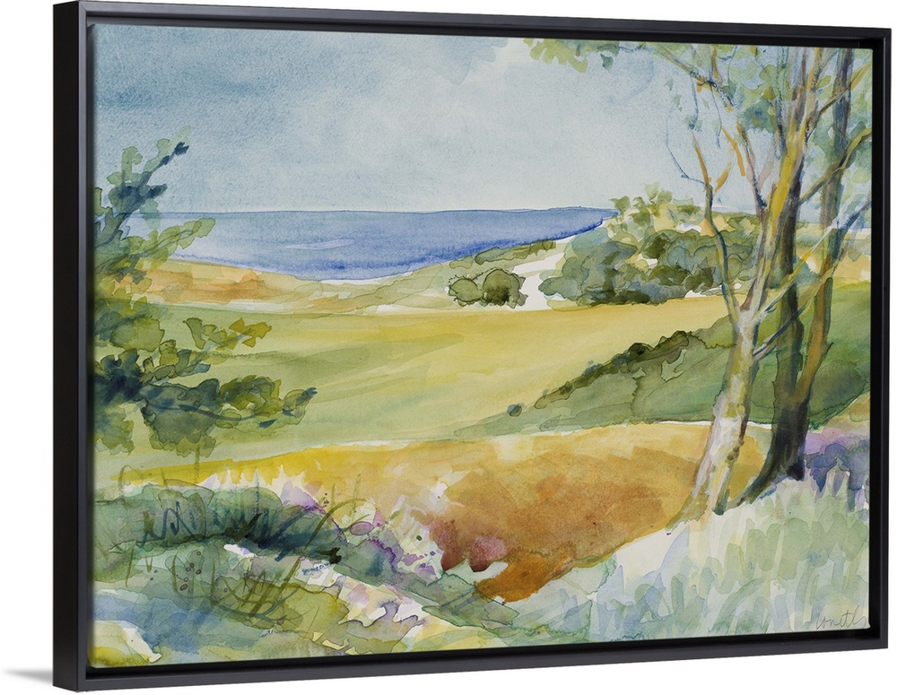 <p>Watercolor landscape painting of trees and bushes overlooking the ocean.</p>