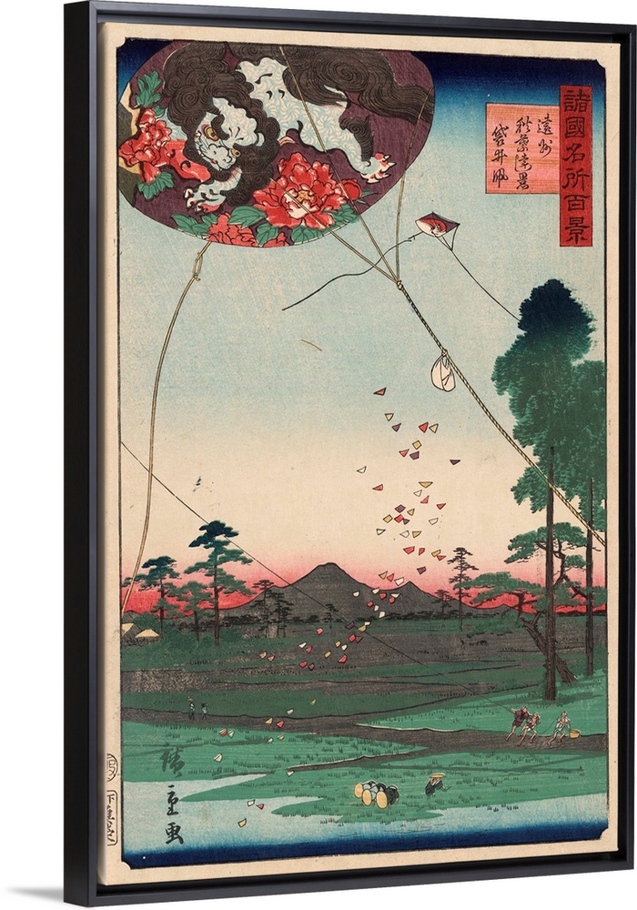 <p>Utagawa, Hiroshige, 1826?-1869. Enshu akiba enkei fukuroi no tako. Date Created/Published: 1859. Color woodcut print; 35.8 x 23.7 cm. People flying kites with open fields and mountains in the distance. From the series: Shokoku meisho hyakkei : One hundred famous views of the country.</p>