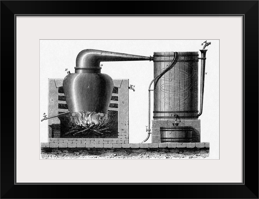 <p>Distillation apparatus, 18th century. Artwork of the alambic equipment developed by the French chemist Jean-Antoine Chaptal (1756-1832) in 1780. The liquid to be distilled was heated in the alambic vessel (left), the vapour condensed in a cooling system (right), and the distillate then collected through a tap (lower right). The techniques of distillation were advanced in the 18th and 19th century by French distillers and winemakers. Engraving from 'Grands Hommes et Grands Faits de l'Industrie' (Great Men and Great Facts of Industry), published in France circa 1880.</p>