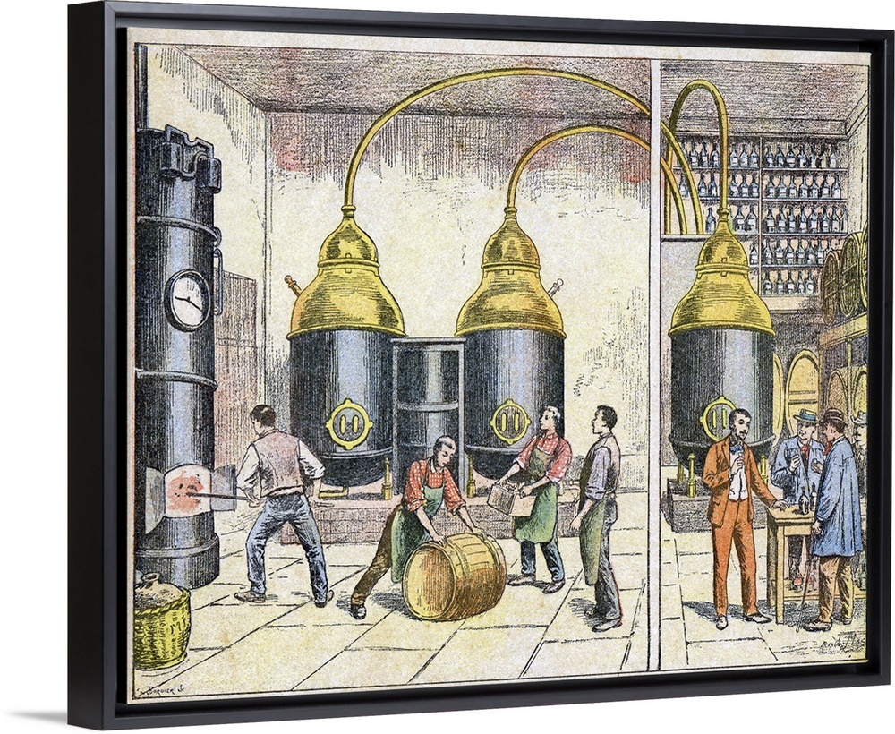 <p>Distillery, 19th century artwork. Workers participating in various stages of the distillation process. At left, the boiler is being refuelled and stoked to provide the heat needed to boil the alcoholic liquid being distilled. At centre, vats of wine or other alcoholic drinks are being moved. In the background, distillation equipment is being used to produce concentrated alcoholic liqueurs, with the vapours carried from the vats through pipes to condensation chambers. At right, the liqueurs produced are being sampled. This artwork is from a French school textbook, dating from circa 1890-95.</p>