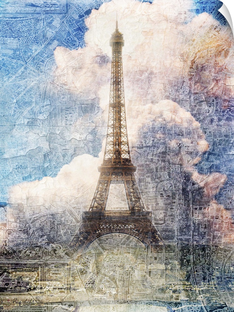 <p>Artistic photograph of the Eiffel Tower and large clouds, with a rough texture overlay.</p>