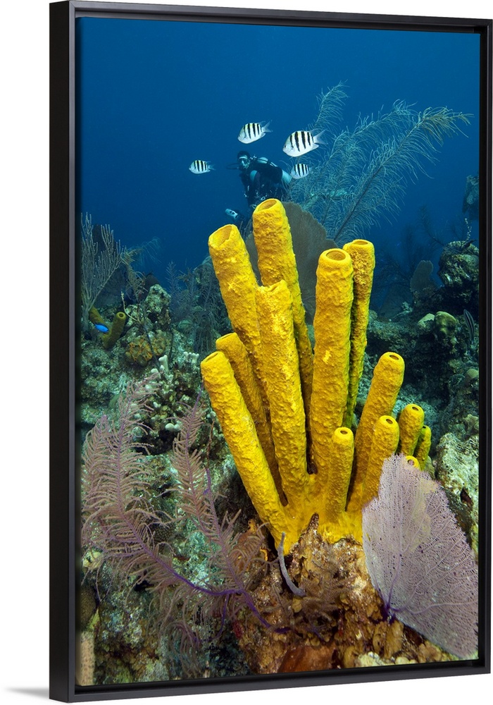 <p>MR scuba diver and beautiful reef scenic with sea fans, yellow tube sponges and fish.</p>