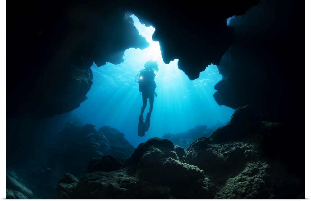 <p>Diver entering a crevice at Yap Cavern's off the very south end of the island of Yap; Yap, Micronesia</p>