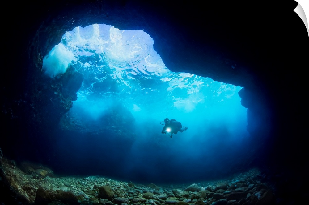 <p>Diver inside a shallow tide pool canyon off the backside of Lanai near Kaumalapau Harbor; Lanai, Hawaii United States of America.</p>