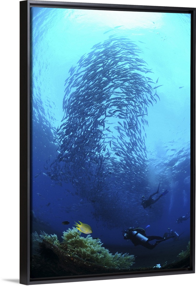 <p>Divers photographing a school of trevally, Bali, Indonesia.</p>