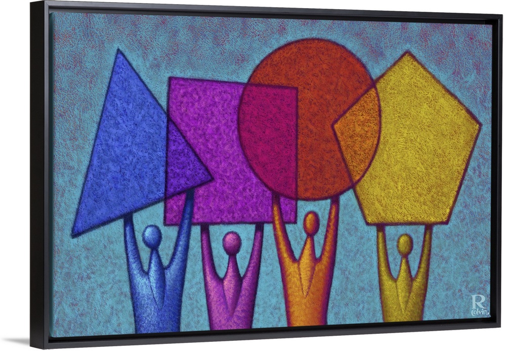 <p>Digital painting of four figures holding differing shapes up together as a team.</p>