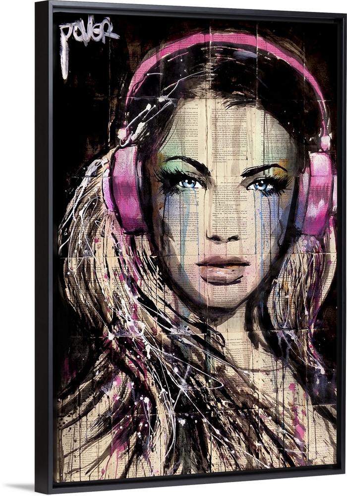 <p>Contemporary urban artwork of a woman wearing pink headphones and looking at the viewer with a piercing gaze.</p>