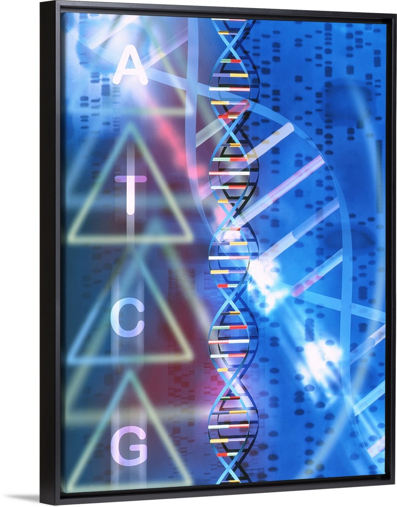 <p>DNA. Computer artwork of a DNA (deoxyribonucleic acid) double helix (centre) and its constituent nucleotides (left), seen against autoradiograms of genetic sequences (right). Nucleotides are the complex chemical groups that make up the spiralling strands of the DNA helix (blue). Complementary pairing between the base groups of nucleotides on opposite strands holds the helix together. The sequence of the 4 base groups (adenine, A; cytosine, C; guanine, G; and thymine, T) along the DNA helix is unique for every individual, and is known as the genetic code. The autoradiograms depict DNA base sequences, each band (dark blue) representing an individual base.</p>