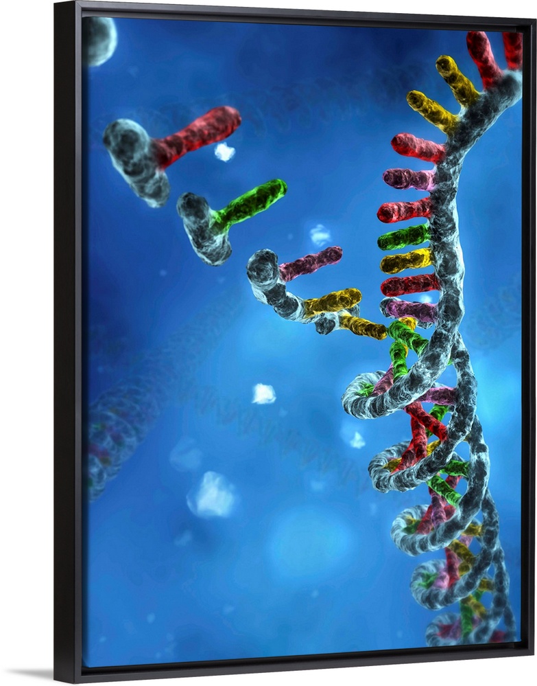 <p>DNA assembly. Computer artwork showing nucleic acid bases (upper left) binding together to form a double-helix of DNA (deoxyribonucleic acid, lower right). This process occurs naturally in cells as DNA replication, which is needed in order to pass genetic information to offspring. The mechanisms that control DNA formation are exploited in genetic engineering. Here, the sequence assembly involves aligning and merging many fragments of a much longer DNA sequence in order to reconstruct the original sequence.</p>
