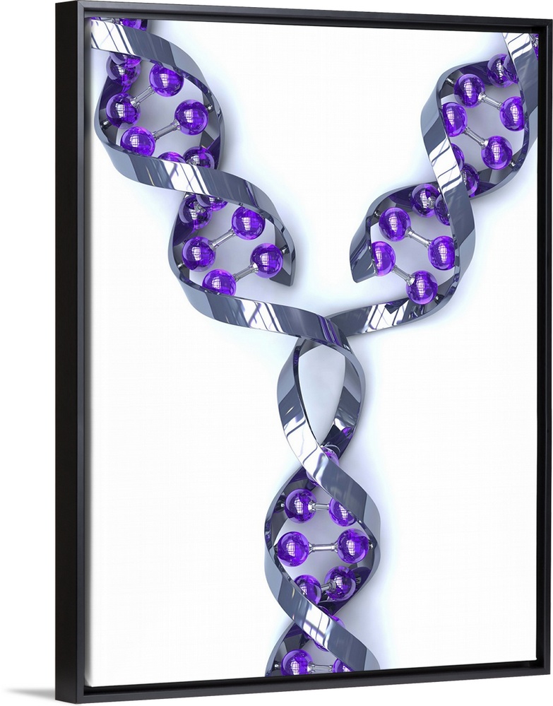 <p>DNA replication. Computer artwork of a DNA (deoxyribonucleic acid) molecule replicating. DNA is composed of two strands twisted into a double helix. Before replication the strands separate from each other. Each strand then acts as a template for the formation of a new DNA molecule (top left and top right). This is known as semiconservative replication. DNA contains sections called genes, which encode the body's genetic information.</p>