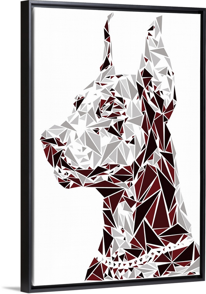 <p>A doberman pinscher made up of triangular geometric shapes.</p>