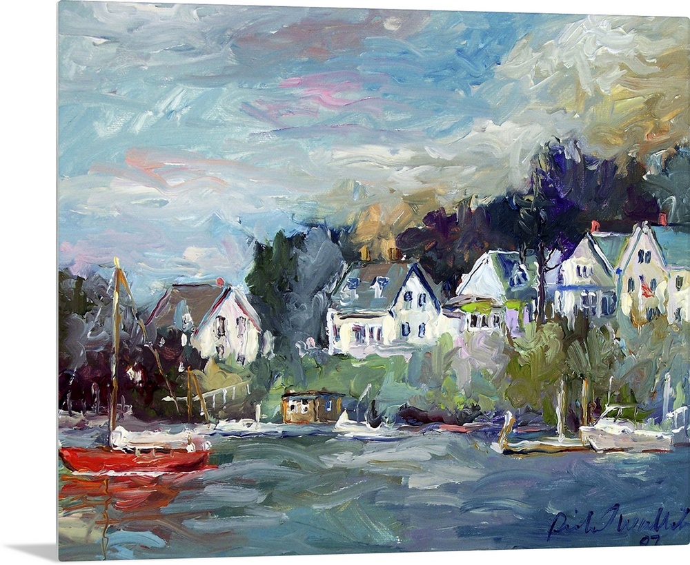 <p>Contemporary painting of a small coastal town harbor.</p>