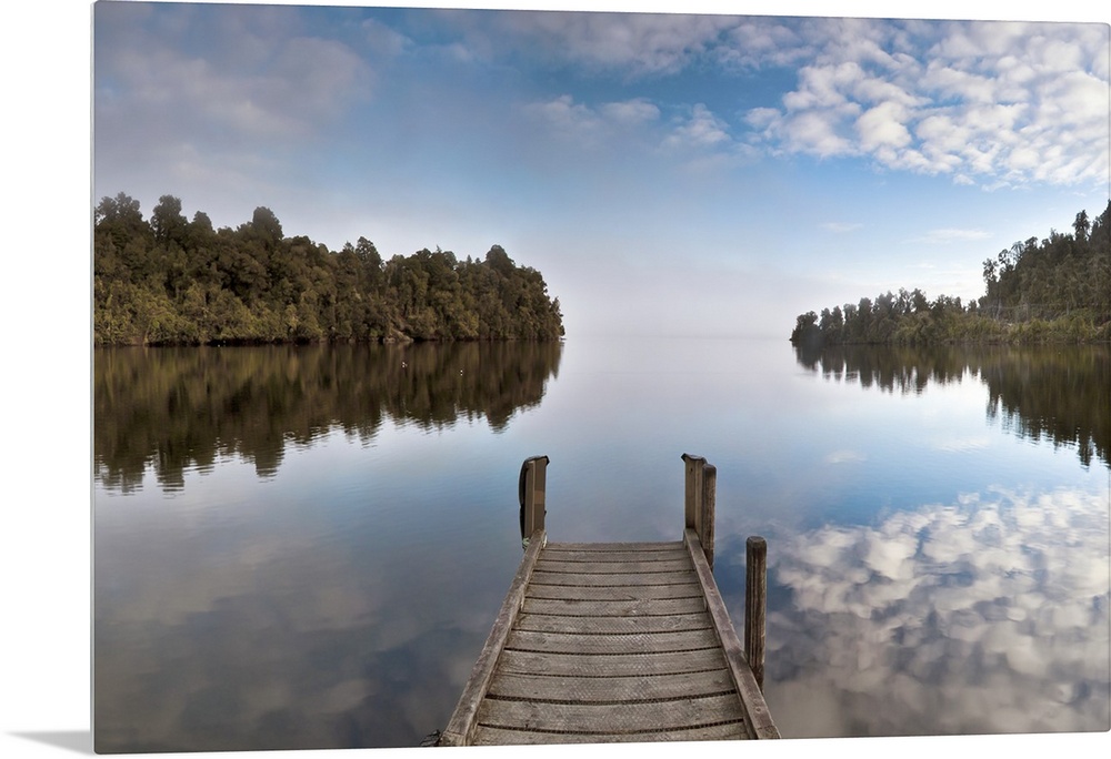 <p>Lake Mapourika, early morning panorama with mist rising off water, near Franz Josef Glacier, Westland National Park</p>