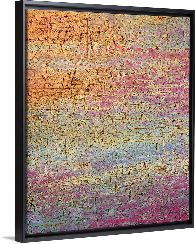 <p>Abstract macro image of paint and rust on a vintage Dodge truck, in shades of bright pink and gold.</p>