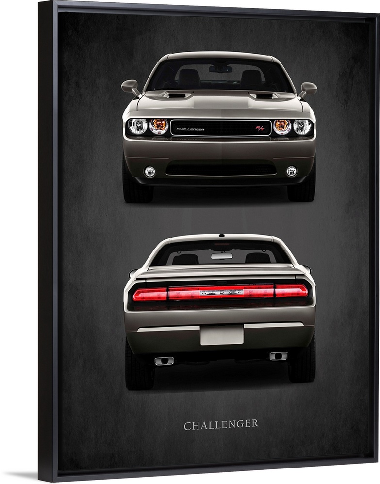 <p>Photograph of a charcoal Dodge Challenger RT printed on a black background with a dark vignette.</p>
