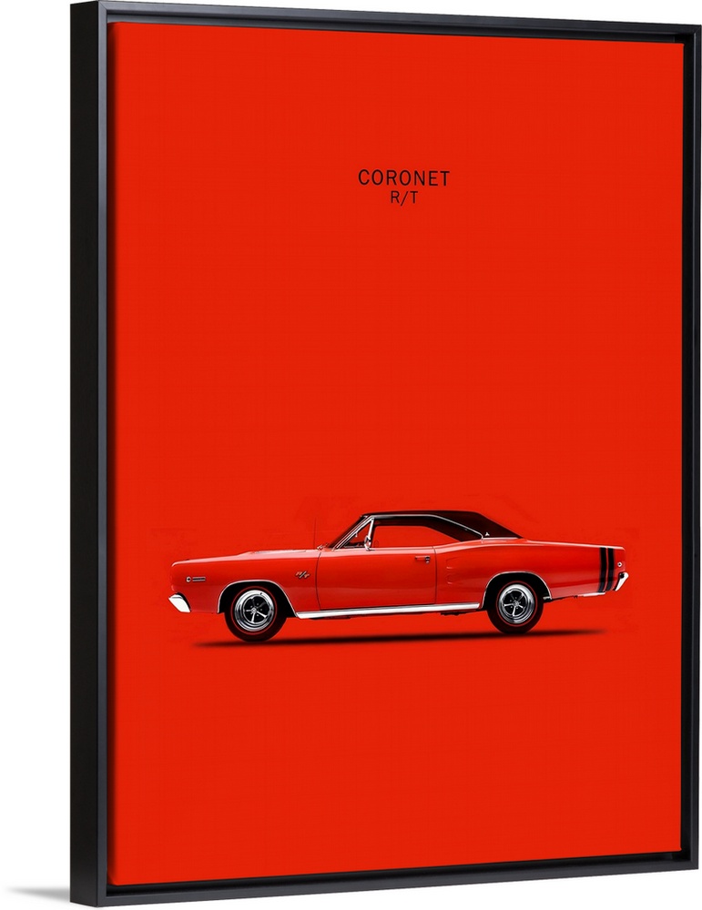 <p>Photograph of a bright red Dodge Coronet RT426 Hemi 1968 printed on a red background</p>