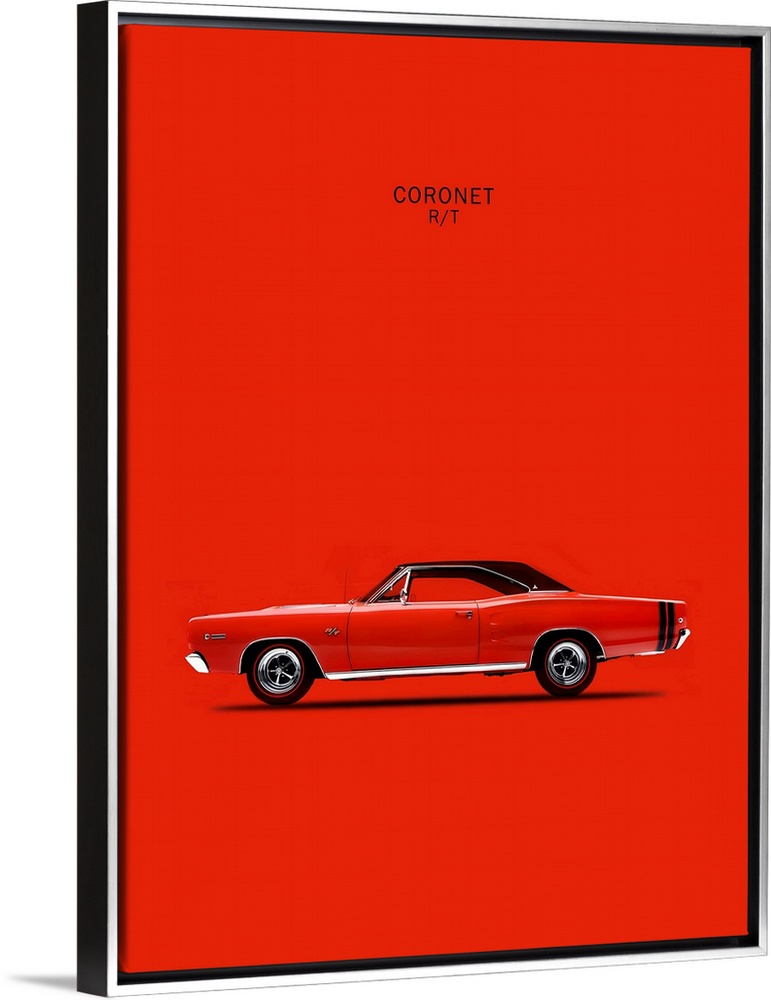 <p>Photograph of a bright red Dodge Coronet RT426 Hemi 1968 printed on a red background</p>