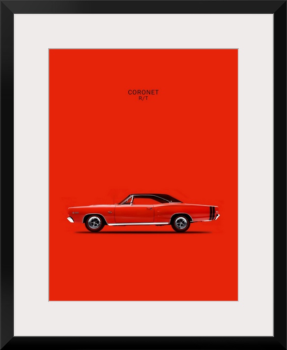 <p>Photograph of a bright red Dodge Coronet RT426 Hemi 1968 printed on a red background</p>