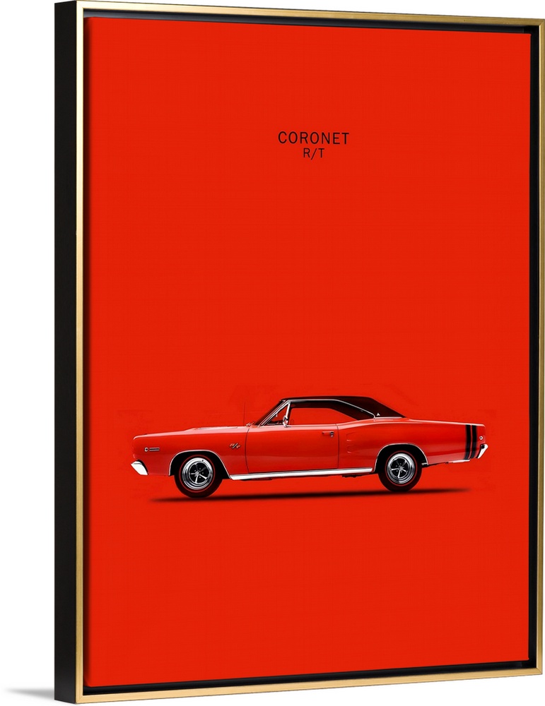 <p>Photograph of a bright red Dodge Coronet RT426 Hemi 1968 printed on a red background</p>