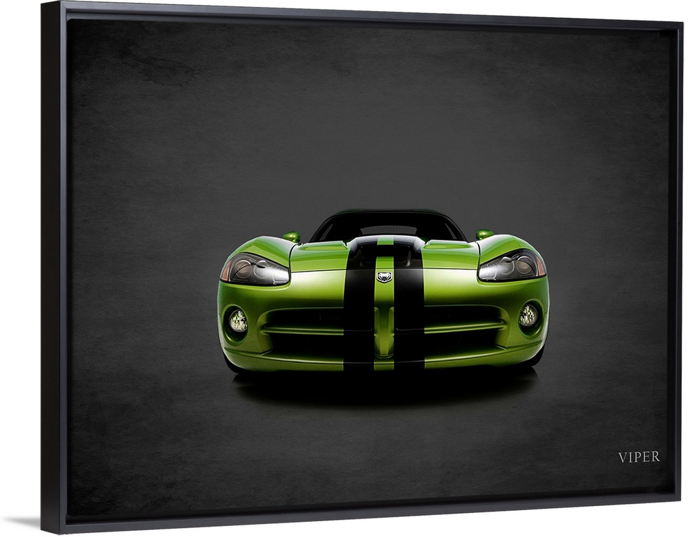 <p>Photograph of a green Dodge Viper with black stripes printed on a black background with a dark vignette.</p>