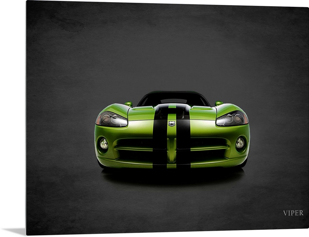 <p>Photograph of a green Dodge Viper with black stripes printed on a black background with a dark vignette.</p>