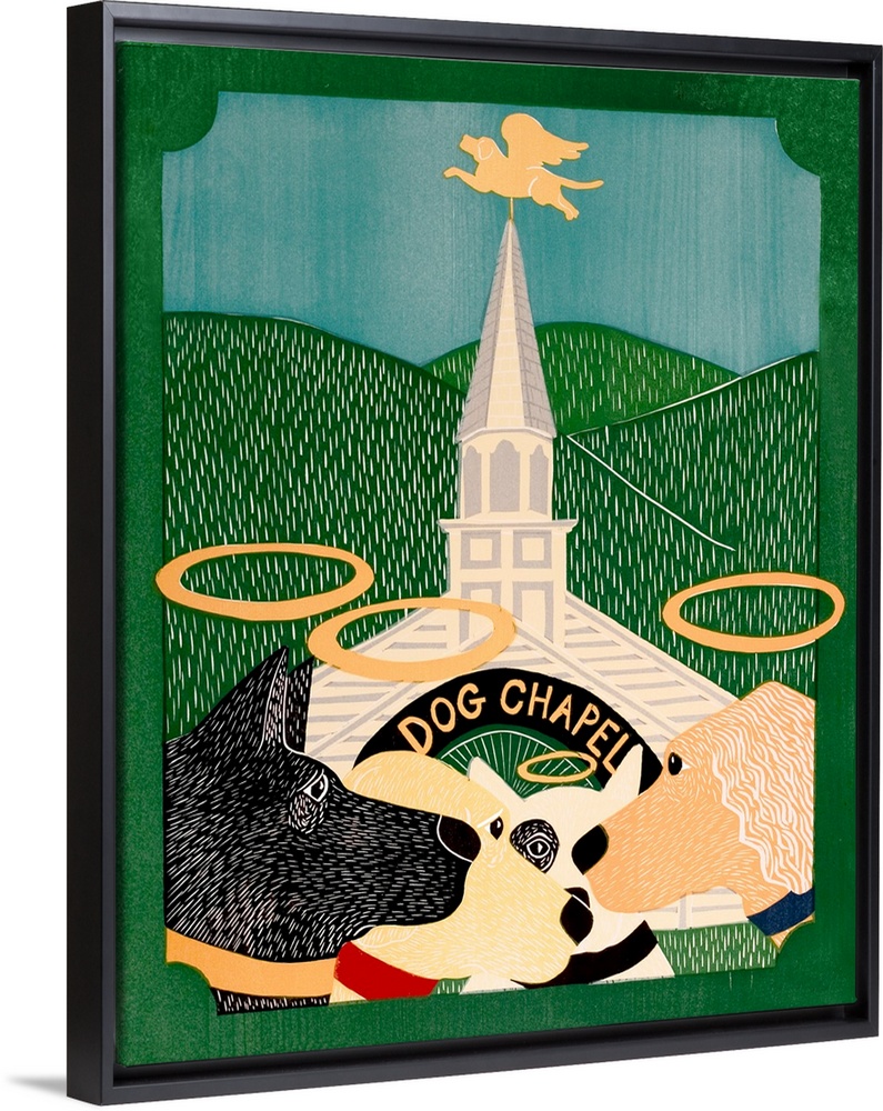 <p>Illustration of different breeds of dogs with halos outside of a Dog Chapel.</p>