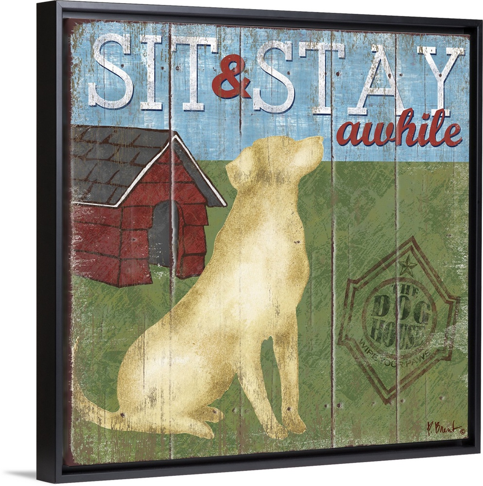 <p>Contemporary decorative artwork of a labrador dog next to a doghouse with the words "sit and stay awhile."</p>