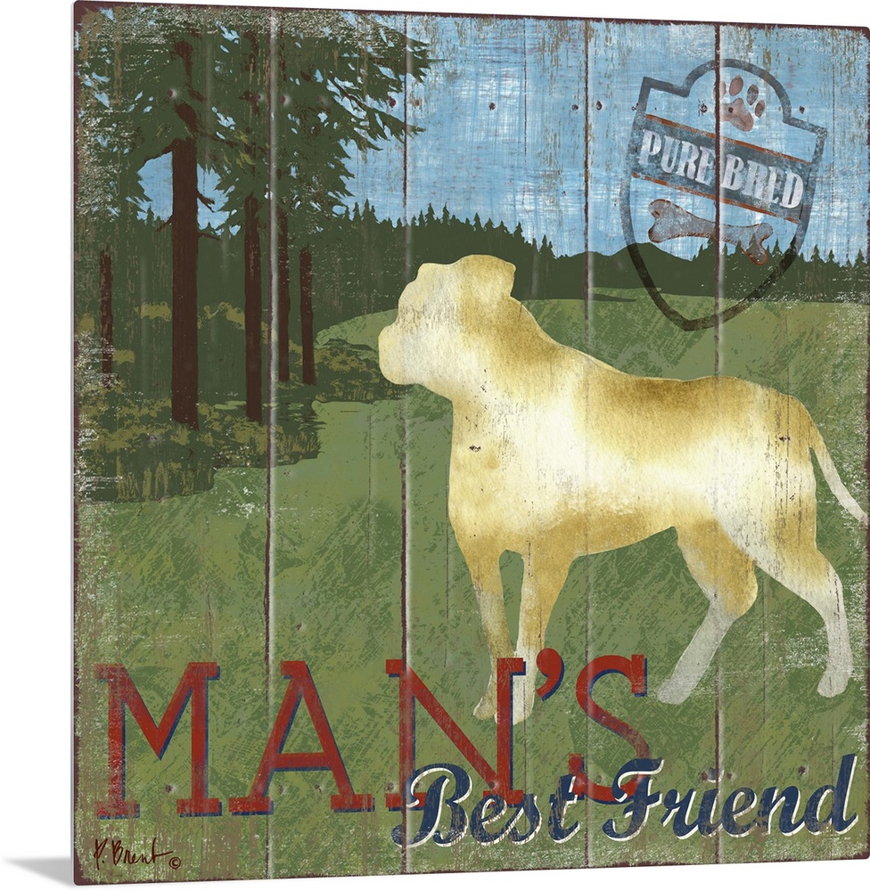 <p>Contemporary decorative artwork of a pit bull dog on a boat with the words "Man's Best Friend."</p>
