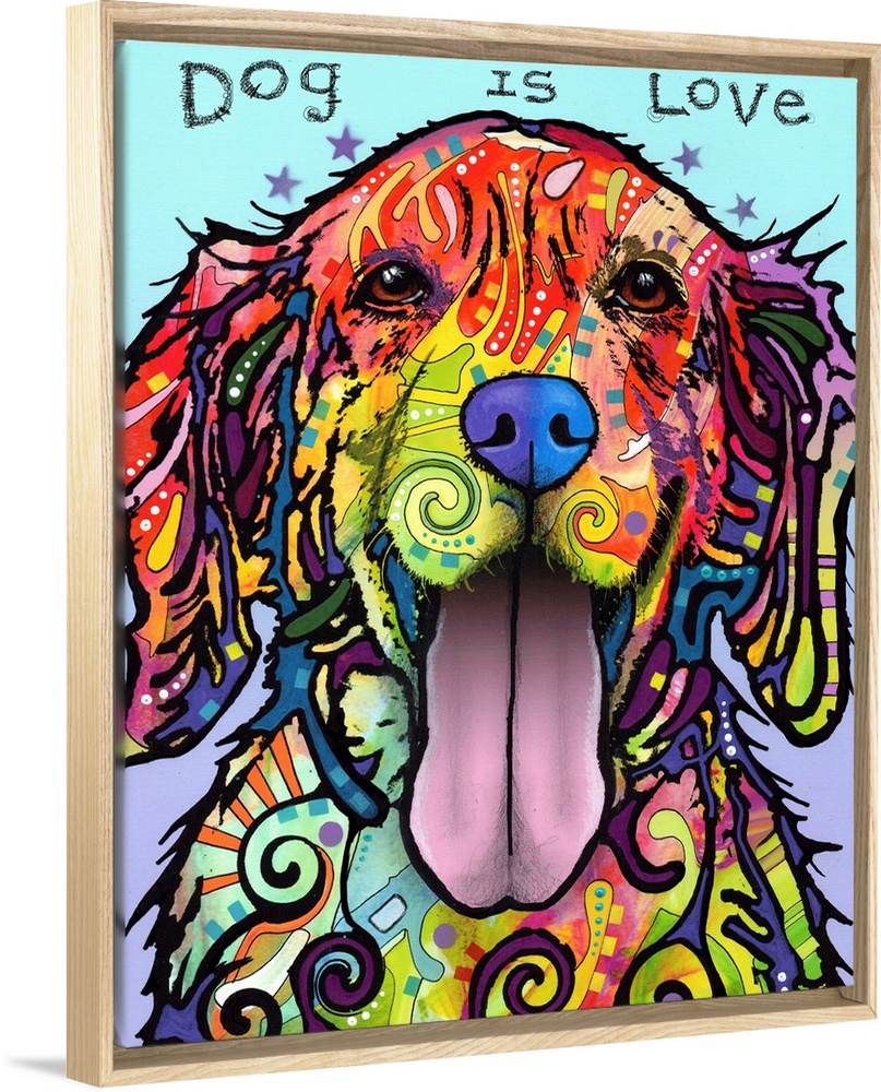 <p>"Dog is Love" handwritten above a colorful painting of a dog with its tongue out and abstract markings on a light blue and purple background.</p>