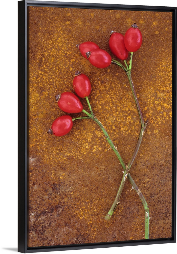 <p>Two stems of Dog rose or Rosa canina lying with their ripe shiny red rosehips on rusty metal sheet</p>