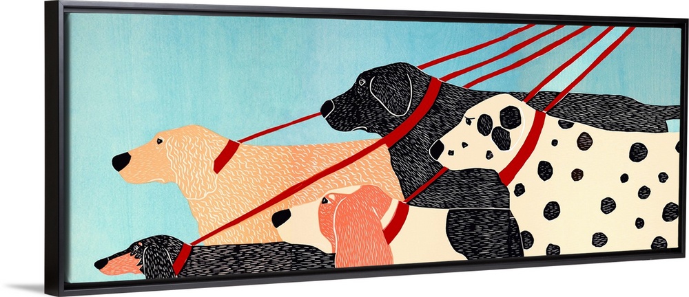 <p>Illustration of five different dogs walking with red leashes by their dog walker.</p>