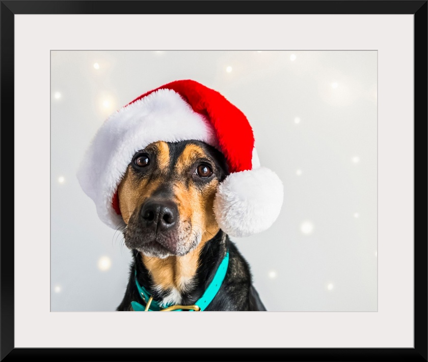 <p>Dog wearing a Santa Claus hat for a Christmas portrait</p>