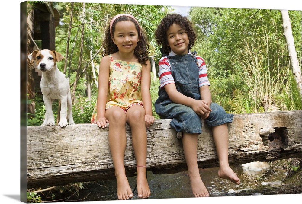 Dog with boy and girl on footbridge over stream