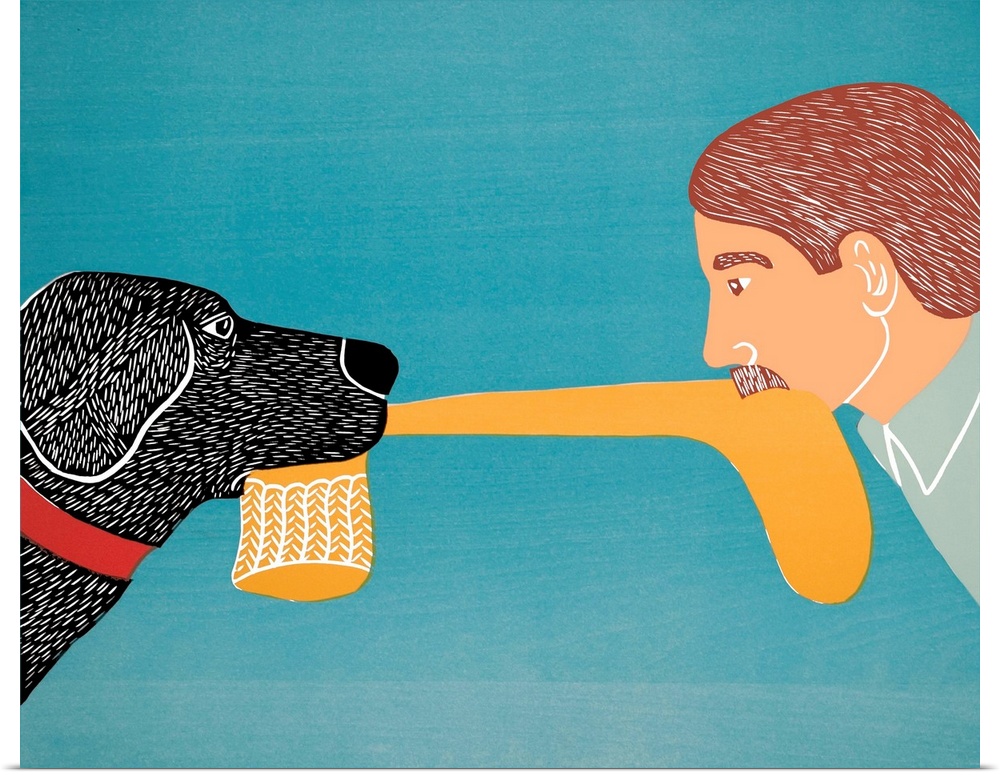<p>Illustration of a black lab and a man playing tug-a-war with a yellow sock.</p>