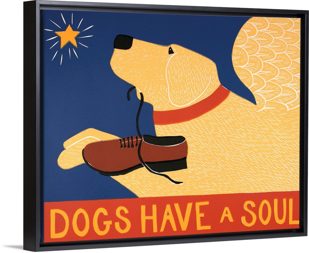 <p>Illustration of a yellow lab with angel wings flying towards a star and carrying a loafer in its mouth with the phrase "Dogs Have A Soul" written at the bottom.</p>