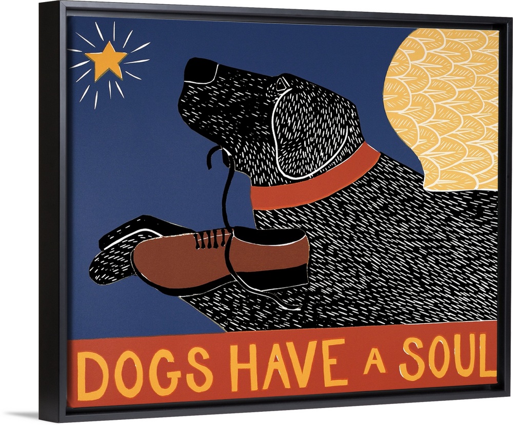 <p>Illustration of a black lab with angel wings flying towards a star and carrying a loafer in its mouth with the phrase "Dogs Have A Soul" written at the bottom.</p>