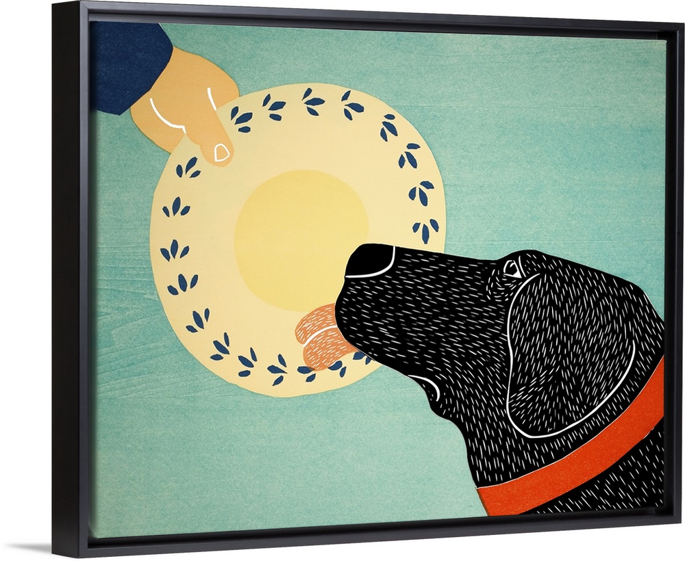 <p>Illustration of a black lab licking a dinner plate clean.</p>