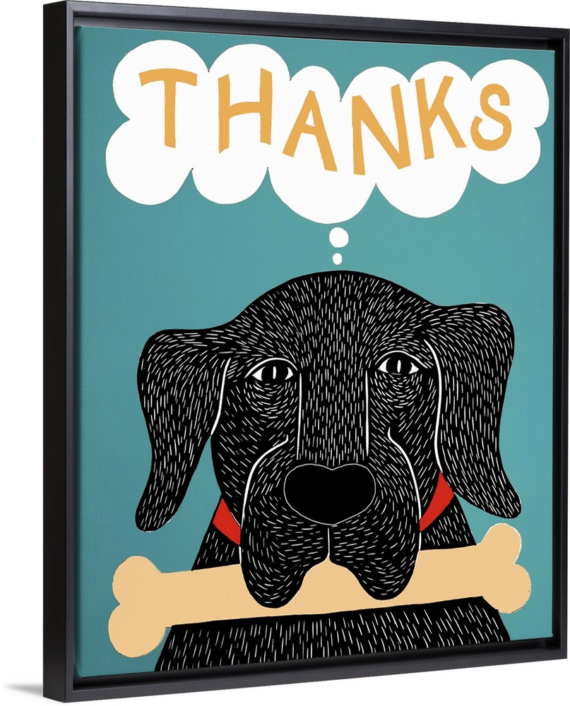 <p>Illustration of a black lab with a bone in its mouth and a though bubble above its head that reads "Thanks"</p>