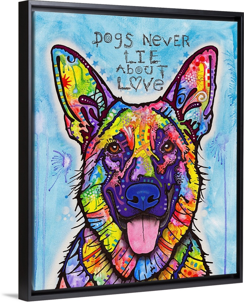 <p>"Dogs Never Lie About Love" handwritten above a colorful painting of a Belgian Sheepdog on a blue background with purple paint splatter.</p>