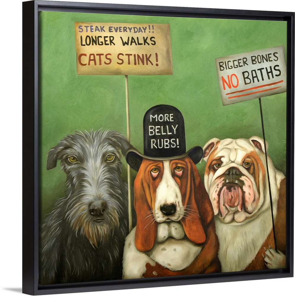 <p>Surrealist painting of a group of dogs protesting.</p>