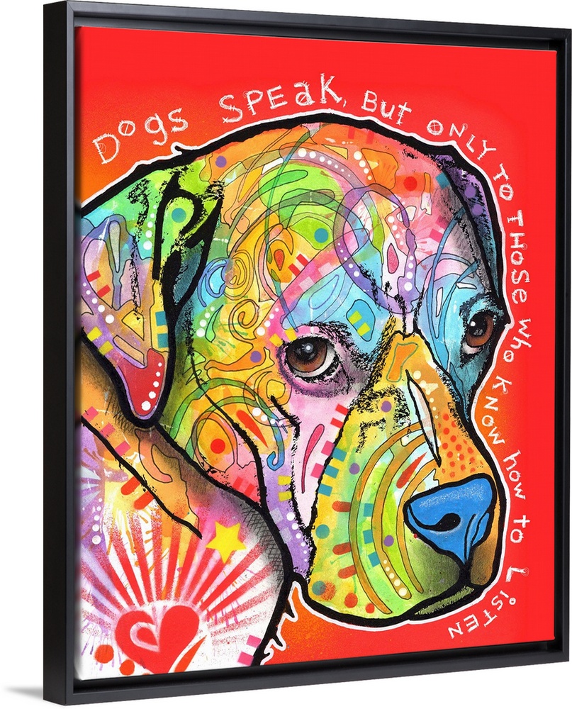 <p>"Dogs Speak, But Only to Those Who Know How to Listen" handwritten around a colorful painting of a dog with graffiti-like designs on a red background.</p>