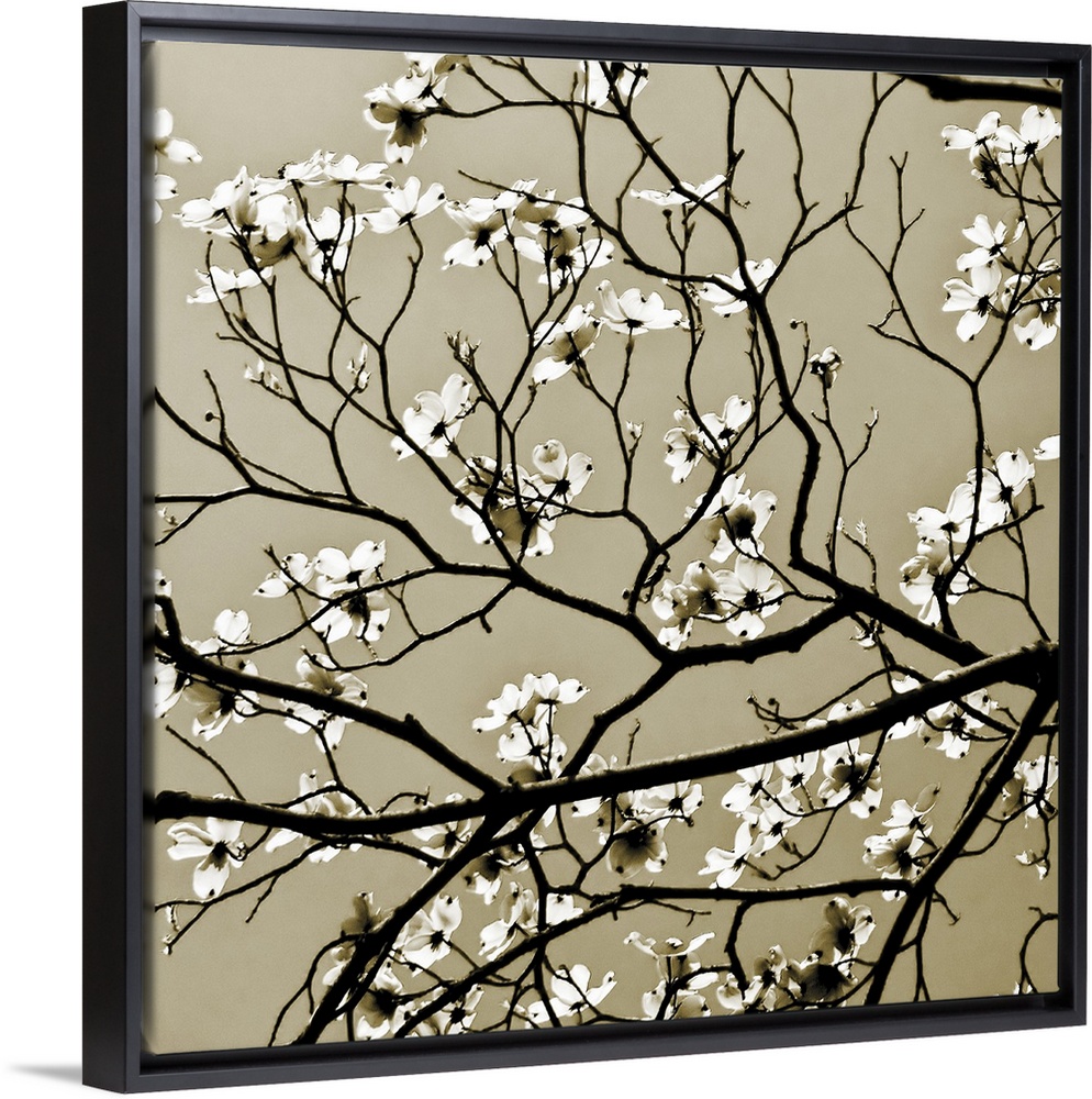 <p>Square photograph on a large wall hanging of blooming branches of a Dogwood tree in the sunlight.</p>
