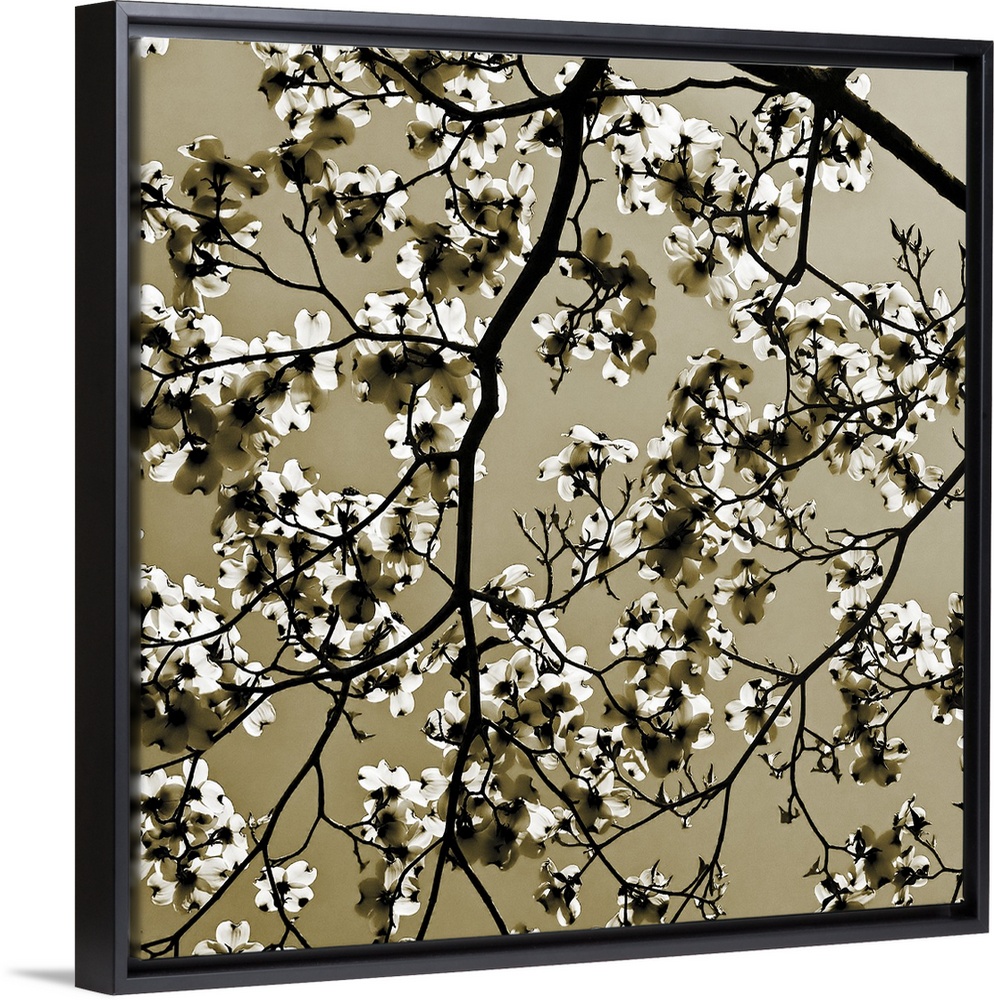 <p>Square, oversized photograph of small branches of a dogwood tree with many clusters of blooms in the sunlight.</p>