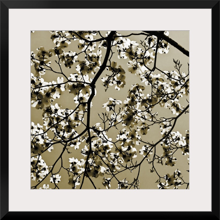 <p>Square, oversized photograph of small branches of a dogwood tree with many clusters of blooms in the sunlight.</p>
