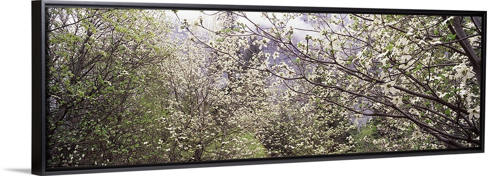 <p>Big panoramic canvas photo of flowers blooming on trees in a forest up close.</p>
